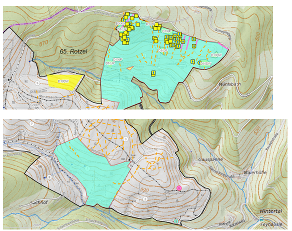 Ab 1. September führen wir am Rotzel beim Hünersedel eine Hiebsmaßnahme durch bis ca. Mitte / Ende Oktober. Dabei müssen auch immer wieder temporär einige Forststraßen gesperrt werden (unten im Bild sind in Türkis markiert die beiden fast nebeneinander liegenden Hiebsflächen mit den entsprechenden Wegen).