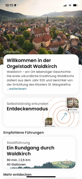 Die von der Tourismusmarketing GmbH Baden-Württemberg ausgezeichnete „Kleinstadtperle“ Waldkirch ist nun über den Zusammenschluss mit 19 anderen Kleinstadtperlen in Baden-Württemberg gemeinsam in einer App vertreten. „Zeigmal“ nennt sich diese und beinhaltet Infos zu historischen Gebäuden, Plätzen und Einrichtungen, die es gab oder gibt. Mit einer digitalen Route kann so die Innenstadt erkundet werden.